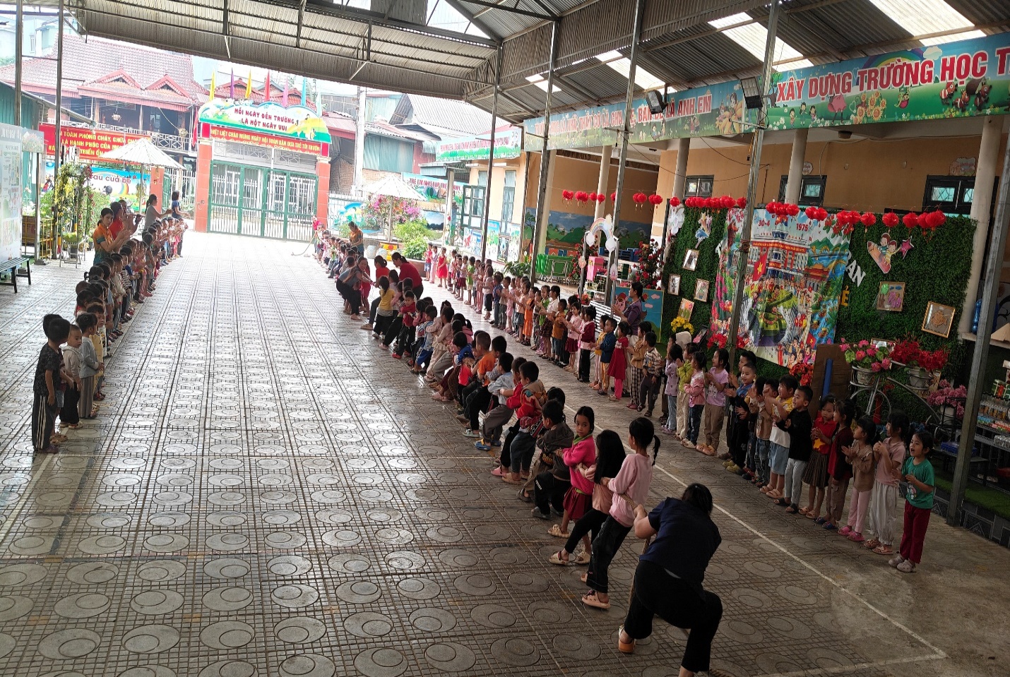 Bên cạnh đó, nhà trường còn tổ chức các trò chơi vận động tập thể như kéo co. Đây là hoạt động thu hút đông đảo trẻ tham gia với không khí sôi nổi, hào hứng. Thông qua trò chơi, trẻ không chỉ được rèn luyện sức khỏe, sự dẻo dai mà còn học được tinh thần đoàn kết, biết phối hợp cùng bạn bè để đạt được mục tiêu chung. Những tiếng cười, lời cổ vũ vang lên đã tạo nên một sân chơi đầy ý nghĩa và gắn kết.